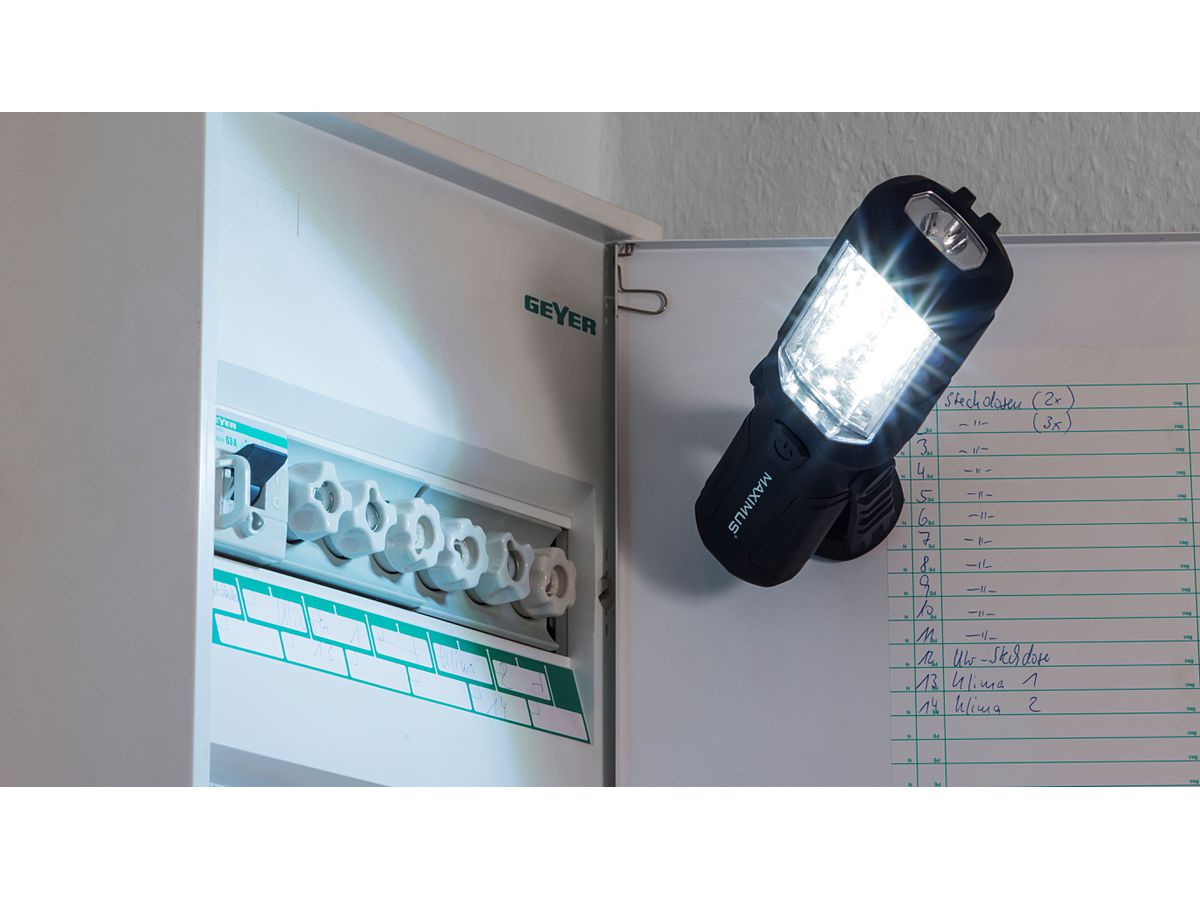 Anmelden3 Watt LED Workinglamp, LED front flashlight, Lichtleistung 240 Lumen COB + 60 Lumen front flashlight, Strahlabstand 22m / 42m (front flashlight), Wasserbeständigkeit IP20, Laufzeit 100% = 6h / 50% = 8h / Front LED=10h, Magnet & Haken